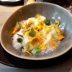 Etwas ängstlich sahen wir dementsprechend dem Zwischengang entgegen. Hier wurden wir jedoch für die anfängliche Tortur entschädigt. Frau Land bekam die selbstgemachten, mit Perigord Trüffel gefüllten Ravioli an Mascarponeschaum und Babyspinat (19,50 €), deren von weichem Nudelteig umschlossene, erdige Pilzfüllung wunderbar mit dem leicht säuerlichen Schaum sowie dem kaum bitteren Babyspinat harmonierte. Allgemein scheint die Küche des „Tipken’s“ eine Vorliebe für florale Dekorationen zu haben, die regelmäßig aber nur das Auge erfreuen, bei der Konsistenz jedoch stören können - und auch nicht geschmacklich zur Komposition gehörten.