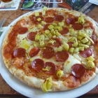 Nach kurzer Überlegung bestellte ich eine Pizza Diavolo (8,80 €) und eine Cola Zero (Flasche 0,2l für 1,90 €). Die wurde auch prompt gebracht, dazu gab es ein Glas mit Eis und Zitronenscheiben. Etwa fünfzehn Minuten nach der Bestellaufnahme wurde dann die Pizza serviert, ein ziemlich großes Exemplar von bestimmt 28 cm Durchmesser. Der Belag war durchaus reichlich, mit Salamischeiben dicht an dicht und vielen Peperonistücken. Geschmacklich war sie gut, die „teuflische“ Schärfe durchaus spürbar.