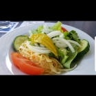 Mit den ersten Getränken kam ein Ouzo auf’s Haus vorab, ein gutes fast schon mildes Stöffchen und kein Rachenputzer. Dann kamen die Beilagensalate, ein pikant gewürzter Mix aus frischen Blattsalaten, Weißkraut und Karottenraspeln, Olive Gurkenscheibe und Tomatenspalte. Sehr gut.