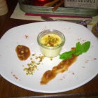 Crème brûlée vom Ziegenkäse mit Avocado-Erdbeer-Chutney und Pistazienkrokant