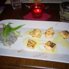 Die Fischwürfel auf beiden Tellern sind leider „totgebraten“ und damit kein bisschen mehr saftig. Die feuchte Begleitung als Soße anstatt Schaum enttäuscht nicht nur wegen der Konsistenz. Obwohl als mildes Wasabi-Zitronengras angekündigt wurde von Beiden Essern zumindest eine kleine Schärfe erwartet. Ein asiatischer Touch oder zumindest der typische Wasabi-Geschmack werden nicht vernommen – Schade – auch wegen der Portionsgröße.