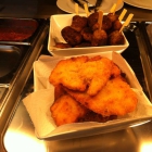 Angeboten werden frische selbstgemachte Gerichte aus regionalen, saisonalen Produkten, die laufend frisch zubereitet werden und das schmeckt man (die Mama ist schließlich eine ausgebildete, versierte Hauswirtschafterin, der das Kochen aus der Hand läuft. Alle Soßen, Suppen, Salate, Kuchen u.v.m werden nach alter Väter Sitte gekocht, gesotten oder gebraten. Fritteuse und Mikrowelle gibt es nicht. Schnitzel und Fleischbällchen kommen aus der Pfanne, wie man auf dem Foto sehen kann. Auch selbstgemachte Fruchtaufstriche (Marmeladen bzw. Konfitüren darf man die zuckerreduzierten Produkte ja nicht mehr benennen) z.T. aus eigenem Obst kann man erwerben.