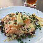 Ich wählte zu Vorspeise Reibekuchen mit Räucherlach, Sahne-Meerrettich und Käse überbacken,zu 6.90 Euro.