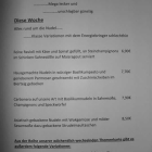 Die Wochenkarte (Di-Fr 12:00 – 17:00 Uhr) enthält ein vegetarisches, zwei Fleisch- und ein Fischgericht (6,50 – 8,50 €). Ich entschied mich für die goldene Mitte, Staigers hausgemachte, echt schwäbische Maultaschen (7,50 €), die sogar schon Frau Merkel geschmeckt haben sollen.