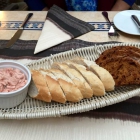 Wir müssen auch nicht lange auf den Gruß aus der Küche warten. Wir sechs erhalten zwei Körbchen mit je sechs Baguettescheiben und je drei rötlich-braunen Scheiben Tomatenbaguette, rötlich-braun wahrscheinlich deshalb, weil außer getrockneten Tomaten vermutlich auch Tomatenmark oder -saft dem Brotteig zugegeben worden ist. Neben dem Brot steht ein weißes Porzellantöpfchen mit Tomatencreme.
