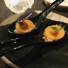 Vorab erhielten wir ein Amuse, bestehend aus 2 kleinen schwarzen Löffeln mit Mohncrumble, gebeizter Heilbutt, Kürbistaler, Currymangodip. Eine sehr schöne Einladung und guter Auftakt.