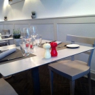 Das Ambiente gefällt, die Fotos der Website haben mich sofort angesprochen. Es gibt acht verschieden große Gasträume mit Platz für gut 45 Gäste. Die unterschiedlich gestalteten hellen Räume wirken frisch und luftig, hellgraues Mobiliar in Kombination mit bunt gemixten Malerutensilien als Deko ergeben ein modern-minimalistisches Gesamtbild. Die Tische sind mit Wein-/Wassergläsern, grauen Stoffservietten, Vorspeisenteller, Besteck, Salz-/Pfeffermühle sowie Teelicht und einem kleinen Blumentopf eingedeckt.
