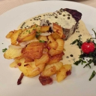 Mein Pfeffer-Filet wird mit einer Portion gut gerösteter Bratkartoffeln und einer angedünsteten Cherrytomate angereicht. Es liegt in einer Pfeffersauce auf Rahmbasis und wird auch großenteils von ihr bedeckt.