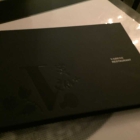 Es gibt hier eine kleine schwarze Speisekarte mit dem Logo und Namen vom Lokal vorne drauf.
