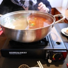 Als Hitzequelle wurde ein Gasbrenner auf den Tisch gestellt, dessen Flamme sich sehr gut regulieren ließ. So kann man von Simmern bis Wallen seine Wunschtemperatur einstellen. Von unserer Bedienung bekamen wir einige Anwenderhinweise (das Sieden abwarten und nicht alles auf einmal ...). Während der Arbeit schaute man gerne vorbei, um sich zu erkundigen, ob wir denn zurecht kämen und ob es schmecke.