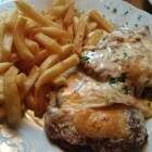 Die beiden Schnitzelgerichte hätte meine Oma auch nicht besser hinbekommen. Man durfte nur kein Gegner von Röstaromen sein, den beide Teller hatten viele davon. Die Schnitzel meiner Frau unterschiedlich braun gebacken, mit leichtem Butter Geschmack. Die Bratkartoffeln aus echten Kartoffeln (Pellkartoffeln), leicht angebrutzelt, es fehlte nur etwas Salz. Meine zwei Schlemmerschnitzel bestanden aus Speck, Vorderschinken, Lauch, weißer Champignonsauce, das ganze wurde mit Goudakäse überbacken. Allerdings waren die beiden Schnitzel so dick, da hätte man auch jeweils 2 aus einem machen können, also hatten wir eigentlich 4 Schnitzel zu essen, dennoch waren sie schön saftig und sehr gut schmeckend. Die weiße Pilz-Käse Sauce hatte es mir angetan, die war ausgezeichnet. Die Pommes waren ordentlich frittiert, hatten eine schöne Bräunung, allerdings fehlte etwas Salz oder ein wenig Pommesgewürz (??)