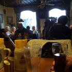 Am Lokal angekommen stolperte ich erst mal über einen Gedenkstein am Eingang des Lokals, das Restaurant scheint es schon knappe 450 Jahre zu geben, wenn ich daran denke dass viele Städte noch nicht mal 450 Jahre alt sind, ist das schon eine verdammt lange Zeit. Im Sommer kann man wohl auch vor dem Lokal sitzen, wir sahen einige Sitzgelegenheiten. Im Lokal drin kam uns erst mal ein hoher Geräuschpegel entgegen. Viele, auf den zweiten Blick zu viele Gäste waren hier. An einem 8er Tisch saßen insgesamt 10 Gäste, wohl aus drei unterschiedlichen Familien. uns wurde auch gleich , noch 2 freie Plätze an einem großen 12er Tisch angeboten, an dem auch mehrere Familien saßen, wir fühlten uns etwas unwohl. Auf einmal wurde im hinteren Eck an einer Glastrennwand die gut und gerne aus dem 2. Weltkrieg stammen könnte frei, keine 30 Minuten später stieß aber dann Opa, Oma und Enkel noch bei uns dazu, das scheint hier Standard zu sein, uns hat es nicht gestört, im Gegenteil, wir diskutierten am Schluss ein wenig über die Flüchtlinge und deren Problematik.