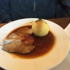 Der Schweinebraten war zart und saftig und war einfach gehalten vom würzen her. Die Soße war Natur belassen und hatte etwas mehr Geschmack. Eine einfache Bratensoße halt. Man konnte aber raus schmecken dass sie mit Gemüse angesetzt wurde. Wir hätten uns ein wenig mehr Würze und Raffinesse gewünscht. ( Liegt vielleicht auch daran das die Gäste einen sehr hohen Altersdurchnitt hatten bei unserem Besuch). Schön dass es auch ein Stück Haut dabei gab. Die lacht einen an und man freut sich auf das knuspern, das viel aber aus, sie sah nur so aus und war sehr lapprig. Der Knödel hatte eine schöne Konsistenz und war mit Bröselschmelze bestreut. Diese hatte einen schönen Buttergeschmack mit leichter Nußnote. Gefüllt war er mit Brotkern und er schmeckte schön nach Kartoffeln.