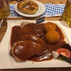 Die Mannsbilder entschieden sich für den bayerischen Schweineschinkenbraten mit Rotkohl und Knödeln (11,90€). Serviert wurde eine ansehnliche Portion Braten mit viel Soße, zwei selbstgemachten Knödel und Rotkohl. Der Braten war wunderbar, zart, guter Fleischgeschmack. Die Soße dickflüssig, sehr würzig und perfekt an den Klößen haftend. Die Herren waren gut zufrieden.