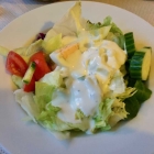 Mein Beilagensalat besteht aus Blattsalaten, Gurkenscheiben, Tomatenachteln, eingelegten Bohnen, Mais und einem Sahne-Joghurt-Dressing. Ob dieses aus der Flasche stammt oder selbstgemacht ist, habe ich nicht feststellen können. Der Salat ist jedenfalls frisch und knackig. Er schmeckt mir sehr gut.