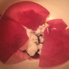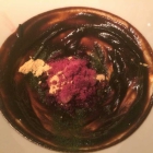 Das abschließende Dessert wird von einem der Köche an den Tisch gebracht und etwas wortkarg vollendet. Drei Tage gekochte Bete, die dadurch dick, cremig und an Rübensirup erinnernd als Creme an die Schüsselwand drapiert wurde, wird mit einem Granité von Aroniabeere und Rose versehen. Das gibt interessante Kontraste und sicher ist es ein schöner Lerneffekt zu erfahren, was aus Rote Bete nach so langer Garung wird. In Summe war mir das aber erneut zu süß und mit dem ersten Dessert war ich glücklicher.