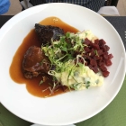 • zwei geschmorte Kalbsbäckchen, dazu Kartoffelstampf und Rote-Bete-Gemüse (24,50 €) und
