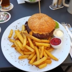 Aus der Karte lachte mich natürlich gleich ein Cheeseburger an welcher mit 180g saftig gebratenem Rindfleisch, Tomaten, Salat, roten Zwiebelringen, Cheddarkäse und Burgersoße (10,90) offeriert wurde.