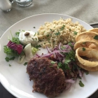 Die drei Stück Kalamari waren schön heiß, mit leichtem Teig überzogen, auf den Punkt gegart und wohlschmeckend. Etwas Zitrone wäre noch schön gewesen. Zum Gyros gab es rote Zwiebeln und es war richtig schön saftig, teils knusprig und vom würzen her klasse. Das Biffteki leicht fluffig, saftig gebraten, gut gewürzt, uns fehlt hier ein wenig der Knoblauch Geschmack. Der Reis war auf dem Punkt gegart, man schmeckt eine leichte Butternote heraus und war mit Kräutern verfeinert.
