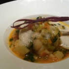 Adlerfisch mit Safran (€ 27,--) wunderbar auf der Haut gebraten, saftiger Fisch (er zappelte fast noch auf der Gabel), umspielt von einem Hauch von Safranschaum, herrlich abgeschmeckt – und ohne eine Wasserpfütze zu hinterlassen – Blattspinat. Meine Verehrung an die Küche!!
