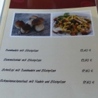 Die Speisekarte bietet eine Auswahl interessanter und regionaler Gerichte. Saisonal wurden verschiedene Steinpilzgerichte angeboten. Die Speisen, die an den Tischen serviert wurden, sahen alle sehr appetitlich aus. Ebenso die Kuchenauswahl in der Glasvitrine.