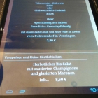Bestellt wurden als Vorspeisen die Maronen-Creme-Suppe ( € 4,00 ) und die gegrillten Peperoni ( scharf ) in Knoblauchöl gebraten mit frischen Gartenkräutern ( € 6,50 ). Für die Jungs sollten es mal wieder Schnitzel mit Pommes ( bitte ohne Salat ) sein ( € 10,50 ). Schwiegermuter entschied sich für geschnetzelte Hähnchenbrust mit Apfel und Ananas in Currysauce auf Bio - Basmatireis mit Beilagensalt ( € 14,90 / kleine Portion ), meine Frau für einen Flammkuchen mit Schafskäse und Peperoni und ich wählte das Weinstraßenschnitzel mit Bio – Weingelee und Käse überbacken, dazu Pommes und, na klar, Bio–Salat ( € 13,50 ).