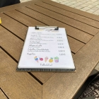 Es gibt hier ein kleines Klemmbrett mit laminierten Zetteln drauf. Es werden Eis , Waffeln , verschiedene Frühstück in herzhaft uns süß , Flammkuchen, Wraps, Toasts und Bruschetta angeboten. Ein kleiner Mittagstisch ist auch im Angebot. Im inneren kann man aus einer großen Auswahl an Kuchen und Torten sich was aussuchen.