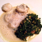 Hauptgang Fisch, Pastinakencreme, Topinamburchips, Nussbutterschaum: Zusätzlich waren noch gegarte Pastinaken mit angerichtet. Die Pastinakencreme war von hoher Adhäsionskraft. Sie verklebte einem regelrecht den Mund. Das Fischfilet war gegart aber es fehlten eindeutig Gewürze. Ausserdem waren noch Gräten enthalten. Diese wären mit etwas mehr Sorgfalt in der Küche vermeidbar gewesen.