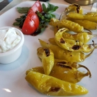 Mit Tempo ging’s weiter. Die Peperoni kamen und gingen gleich wieder. Zumindest eine Ahnung von Röstung wär ganz schön. Gleich nochmal auf den Grill. Den zweiten Versuch ließ ich notgedrungen gelten. Allerdings bestätigte der Anschnittversuch die optische Befürchtung: Ordinäre eingemachte Ware aus dem Glas. Zähe, ledrige Haut, einigermaßen Schärfe, aber viel zu viel Säure. Dafür 6,5€ ist einfach nur unverschämt. Wie zum Hohn gab es zu jedem Hauptgericht später eine gegrillte frische Spitzpaprika als Topping, weich und aromatisch. So hatte ich mir das eigentlich vorgestellt.