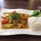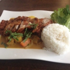 Meine Begleitung wählte ebenfalls von der Mittagskarte: Ga chien Xao Car : Knuspriges Hähnchen mit Curry, Kokosmilch, Süßkartoffeln, Zwiebeln, Gewürzen, Koriander, dazu Reis (8,50 €).