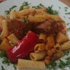 Schon in vorislamischer Zeit wurden Zuckerrohr, Reis und das Huhn aus Indien eingeführt. Die Nahrungsgrundlage bilden Weizen (als Brotgetreide und vor allem in Form von Weizengrieß, Couscous oder Bulgur), Hirse, Datteln(das Brot der Wüste), diverse Gemüsesorten (oft gefüllt, als Schmorgericht oder milchsauer eingelegt) und Hülsenfrüchte. Der Islami lebt ja nach seiner Zeitrechnung erst im 15 Jahrhundert, glaub ich, das erklärt natürlich einiges. Aber wenn ich daran denke wo wir vor 500 Jahren standen, da steht der Orient-Express um einiges besser da. Meine Frau entscheidet sich für die gemischte Grillplatte, wäre auch mein Favorit gewesen, da ich noch nie in Tunesien war (und wahrscheinlich auch nie freiwillig hinkommen werde), habe ich mich für das tunesische Spezialgericht entschieden "Rigatoni mit geschmortem Kalbsfleisch,mit Kichererbsen und Kartoffeln in pikant feuriger Tomatensauce" Abropo: Ziegen, Schafe, Hühner, seltener Rinder und Kamele decken im Orient den Bedarf an tierischen Nahrungsmitteln. Das ist auch so bei der Grillplatte bei meiner Frau. Mann war ich gespannt, ich dachte immer die Rigatoni kommt aus Italien, wer hätte es denn ahnen können dass der Tunesier die Rigatoni erfunden hat ?? Gut, der Ägypter dachte ja auch er habe die Pyramiden zuerst gebaut, bis er das erste mal "Stargate" geschaut hat :-)