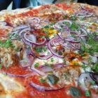 Als wäre sie dem Lehrbuch für italienische Teigfladenoptik entnommen wurde ein paar Minuten später die nach dem Junior des Hauses benannte Pizza „Italo“ (7,50 Euro) aus dem Ofen des Padrons geholt. Thunfisch und Kapern, hauchdünn geschnittene, rote Zwiebeln sowie selbstgemachte Chili-Paste bedeckten den wohlgebackenen Rundling.