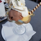 Die Getränke waren fix am Platz, die Eisbecher ließen auch nicht lange auf sich warten. Die Latte wieder typische Automatengetränke, aber angenehm im Geschmack, die beiden heißen Schokoladen waren eher Instandpulver im heißen Wasser angerührt. Naja…. Die Eisbecher selbst waren recht voll, oder aber die Schalen recht klein. Jedenfalls gab es hier Allerweltseis eines großen deutschen Eisherstellers. Mit den Zutaten war man auch etwas spärlich, der Klecks Soße obenauf eher wie beim Eis auf die Hand. Das haben wir schon besser gesehen. Aber so ist das ebend, wenn man Restaurant und Cafe sein möchte. Scheinbar geht nur eines richtig.