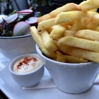 Ich bitte um Verzeihung für die bescheidene Fotoqualität, aber die Wohlfühlatmosphäre im Marie führt zu Lichtmangel bei Mobiles, die Fotos vom essen machen sollen. Makrele kommt einem ja nicht so oft unter in Restaurantkarten, besonders, wenn sie nicht geräuchert ist. Deswegen die Order von mir. Das Filet war gegrillt und vorher oder nachher recht sauer mariniert worden, was natürlich bei diesem fetten Fisch sehr hilfreich ist. Eingefangen wurde die Säure durch den Hummusschaum, der sich ausgleichend im Gaumen anmeldete. Etwas Schärfe durch die Romescosauce, und schon hatte man einen sehr ausgeglichenen Teller vor sich stehen. Ein ungewöhnlicher und sehr erfreulicher Einstieg in mein Abendessen. Gang zwei dann ein Klassiker der französischen Bistroküche.