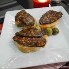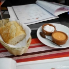 Erst einmal gibt es vom Haus ein Körbchen mit gutem Stangenbrot (leicht warm und mit krosser Kruste) und zwei kleine Schälchen mit Aioli und einem Tomatendip. Das Aioli meint man aufgrund seiner standfesten Konsistenz und Farbe als Quark zu erkennen. Die Farbe beruht aber auf der eierfreien Zubereitung mit Milch. Ich fand die Konsistenz gut und auch die Knoblauchnote war noch ausreichend. Leicht nachgesalzen gefiel mir das Aioli im Vergleich zu den (Industrie)Frechheiten, die man leider immer öfter in iberischen Restaurants als Aioli serviert bekommt, gut. Meine ständige Begleiterin gab mir aber auf zu schreiben, dass ihr das Aioli im Tinto besser gefiele.
