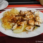 Die großzügig vielen Pulpostücke auf meinem Teller sehr zart auf einem aromatischen Olivenöl und mit grobem Salz und mildem Paprikapulver gewürzt. Eines meiner besten Pulpogerichte! Die Salzkartoffeln passten dazu gut.