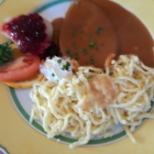 Meine Frau nahm eine kleine Portion Rehbraten mit Preiselbeerbirne in Wacholderrahmsoße, dazu Spätzle und ebenfalls ein Salatteller € 18,90.