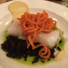 Skrei, in Petersilienöl konfiert, Petersilienwurzel-Püree, Möhrenspiralen & schwarzer Reis. Gibt es Skrei, bestell ich den, der ist sowieso wieder viel zu schnell von den Karten weg, wenn Ende Februar die Fangsaison auf den Lofoten vorbei ist. Gelockt hatte mich auch die konfierte Zubereitung. Gegart in Petersilienöl, sehr spannend. Um diesen aromatischen Fisch hatte man nicht so viel Bohei gemacht, ein gut gebuttertes Püree, knackig blanchierte Möhre und etwas Crunch vom Reis sorgten für Vielfalt auf dem Teller, ohne den Hauptdarsteller zu begraben. Schlicht, lecker, gut! Deutliche Steigerung zu meiner Vorspeise.