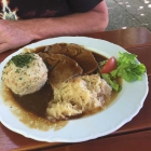 Die Leberknödelsuppe kam leider nur lauwarm an den Tisch. Die Brühe war etwas geschmacksarm, aber lieber so als ob man mit Pulverchen nachhilft. Schade bei den getrockneten Kräutern, hier würde frischer Schnittlauch viel nachhelfen beim Geschmack. Der Leberknödel war schön fluffig, aber doch etwas fester und hatte einen schönen Geschmack nach Leber. Vom abschmecken her gab es hier nichts zu meckern.