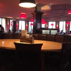 Die Bestuhlung besteht hier aus dunklem Holz und die Tische tragen eine helle Holzplatte. Bei unserem Bereich gab es die Kupferkessel, davor Bänke mit Tischen und Stühlen, aber auch ein paar etwas abgegrenzte Tische mit Stühlen. An einer Wand stand ein Bücheregal.