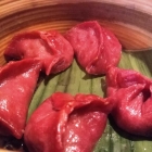 Wir saßen recht bescheiden auf buntbestickten Sitzkissen, welche die Wandbank und die Bambushocker etwas bequemer erscheinen ließen. Auf den hellen, funktionalen Holztischen türmten sich bald die Dampfkörbchen aus Bambus, in denen die kleinen Leckerbissen an den Tisch gebracht wurden. Die orangefarbenen Wände wurden von Tapetenstreifen mit Blumenmustern (in schwarz-weiß) und ein paar gerahmten Bildern etwas aufgepeppt. Ansonsten würde ich die Einrichtung als eher schlicht bezeichnen. Die Küche, die sich im hinteren Bereich des Raumes befand, war nur durch einen Tresen vom Gastraum getrennt, so dass man – je nach Sitzposition – Einblick in die „Dampfarbeiten“ hatte.