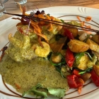 Es war ein ordentliches Stück Fleisch mit Garnelen und reichlich grüne Pesto- Creme. Dazu die Kirschtomaten mit dem Gemüse aus Zucchini , Aubergine , Möhren und Radicchio. Oben drauf, frittierte Spaghetti. Danach ist man eigentlich satt, aber das Dessert rutscht noch zwischen.