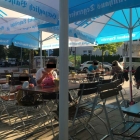 Nun aber zum Bereich wo wir waren. Es ist halt ein Außenbereich an der Straße gelegen, zum Glück aber mit nicht so riesigen Verkehr. Es gibt die typische Biergartenbestuhlung aus braunen Klapptischen und Stühlen. Sitzkissen gab es hier nicht. Der Bereich ist mit Sonnenschirmen beschattet.