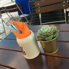 Auf manchen Tischen gibt es einen Krug mit Servietten und Besteck und dazu ein künstliches Blümelchen. An ein paar Tischen gibt es niedliche kleine Glasaschenbecher.