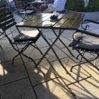 Der Biergarten, mit Blick auf die Elbe, ist recht groß. Die Bestuhlung war sehr rustikal. Holztische und -stühle mit Eisengestellen. Die Tischplatten könnten mal abgeschliffen und neu gestrichen werden. Das würde dem optischen Eindruck gut tun. Ansonsten war der Biergarten mit großen Sonnenschirmen ausgestattet und mit Pflanzen umrahmt
