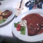 Das Putenrahmschnitzel mit Salz und Pfeffer gewürzt, kein kulinarisches Highlight aber auch nicht komplett tot und damit trocken, die Pommes wie bei den Kindertellern kross und mit ausreichend Salz gewürzt. Diese kamen in in ausreichender Menge in einer Aluschüssel an den Tisch und gehörten zur Hälfte zum Rumpsteak vom Schwiegervater. Die Rahmsoße bestand aus der gleiche dunkle Soße wie bei den Rumpsteaks, hier allerdings mit einem Klecks Sprühsahne anstelle der Pfefferkörner bei der Madagaskarvariante. Für mich ein absolutes no-go, dass ist keine Rahmsoße, aber hiermit sind wir wieder in den 80er Jahren. Mein Rumpsteak wurde mit 230g in der Karte angekündigt, der Koch und Metzger an meiner Seite in Person des Schwiegervaters würde die Gewichtsangabe bestätigen. Auch hier ein großer, weißer Teller mit einem Salatblatt und einem Tomatenachtel als Deko. Das Rumpsteak medium gebraten und zart, die Madagaskarsoße aber wohl dem gleichen Topf entsprungen wie die „Rahm“soße oder die Soße ohne Pfeffer zum anderen Rumpsteak. Geschmacklich hatte das etwas von angerührter Standardsoße, die mit Pfefferkörnern zur Madagaskar- oder mit Sahnetupfer zur Rahmsoße wird. Interessanterweise sahen die Kroketten so gleichmässig aus wie aus den Tiefen des Eismeeres geangelt, ausgerechnet hier schien die vermutete Herkunft nicht zu passen. Der Kartoffelteig im Inneren schön fluffig und eindeutig die Zugabe von Salz, Pfeffer und Muskat zu schmecken. Der Beilagensalat aus grünem Salat, Karotten-, Rotkraut- und Weisskraussalat mit Gurkenscheiben und Weissbrotwürfel im Essig- und Öldressing im Glasteller konnte da auch nichts mehr rausholen. Das das Kindereis zum Nachtisch im Alubecher mit Sonnenschirm ( siehe Foto ) serviert wurde passt zum Gesamteindruck. Nett, okay und irgendwie bei Opus, Modern Talking und Sandra hängengeblieben. Madonna war vor 30 Jahren auch noch in, ist heute aber trotz allem Bemühen nicht mehr sexy. Mehr als 2,5** kann ich für das Essen nicht geben.