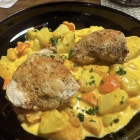 Boah,war das lecker. Das Hähnchen richtig saftig,was ja immer so ne Sache ist, Die Panade mit ordentlich viel Kräuternversehen und dazu diese Ragout. Di e Kartoffeln und Kürbis,waren noch stückig und richtig schön schlotzig,eingekocht. Herrlich cremig. Auch diese Variante,habe ich bisher,noch nicht gegessen. Abere gut. Sehr gut.