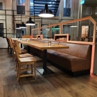 Die ausreichend breiten Tische bieten genügend Platz auch für große Pizzen, auf den Ledersofas, welche an den Raumteilern aufgestellt sind sitzt man gemütlich, einige sind jedoch sichtbar schon durchgesessen. Auf den hölzernen Stühlen fehlt eine Sitzauflage, sodass nach längerer Verweilzeit der Hintern weh tut. Wir hatten nun genug gesehen, und nach knapp 10 Minuten waren nun auch unsere Getränke am Platz, und wir konnten unsere Hauptspeisen ordern.