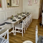 Diese bestehen zumeist aus farblich zueinander passenden weißen Holzstühlen mit grauen Stoffkissen und ebenfalls weißen Tischen mit einer weißgrau grundierten Holzoptik auf deren Platte. Die verschiedenen Formen der Stühle sorgen dabei schon für ein auflockerndes Maß an Abwechslung.