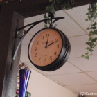 Auch drinnen wirkt die Gaststätte recht einfach – und auch übersichtlich (recht klein). Die Theke fällt als erstes ins Auge (davor stehen noch Barhocker). Die große Uhr an der Decke erinnert an einen Bahnhof – gefällt mir aber. Alles wirkt recht dunkel (Brauntöne). Die Sitze sind schwarz, die Tische braun. Die blanken Platten sind mit einem roten Tischläufer versehen. Am Platz liegt aber wieder eine braune brokatartige Unterlage vor dem Gast. Die Servietten sind aus Papier und wieder rot.
